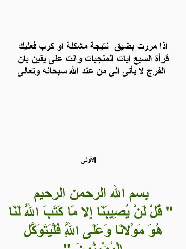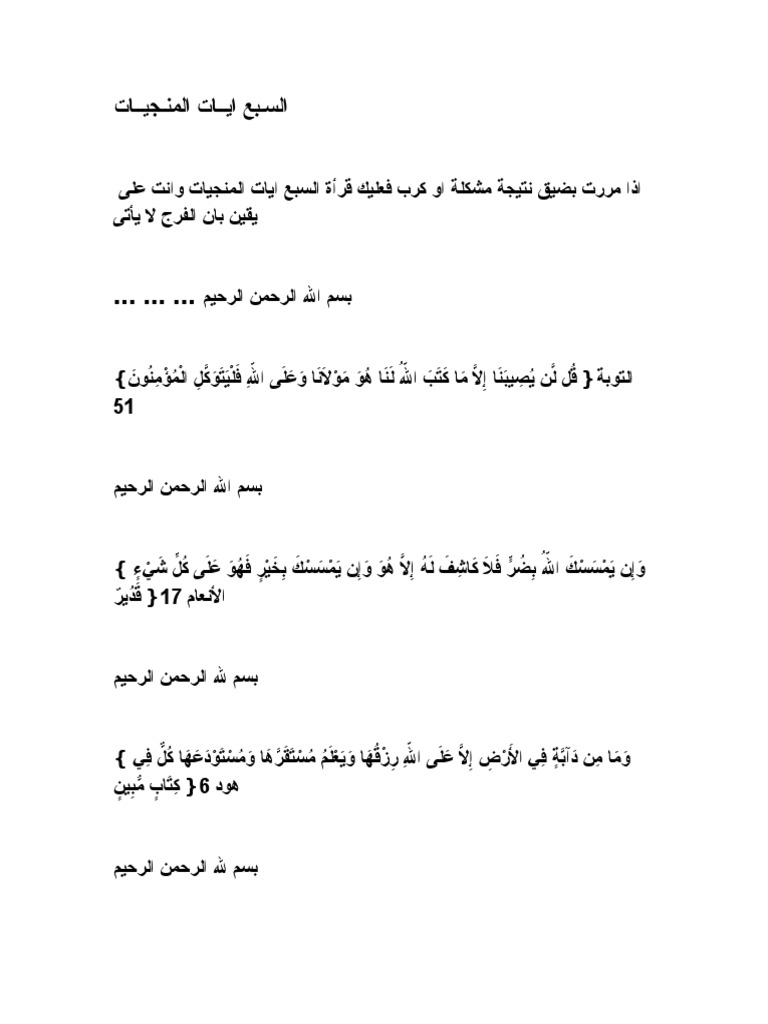 السبع ايات المنجيات pdf. السبع المنجيات ابن باز انتشر بين الكثير من الناس تناقل بعض الآيات أو السور المخصصة والتي أطلقوا عليها اسم السبع المنجيات وهي تطلق على سبع آيات أو سور من القرآن الكريم مخصصة وذكروا ما لها من البركة والنفع والتحصين للإنسان. حياتنا مليئة بالأحداث السعيدة والحزينة بل يشعر الكثير من البشر بالحزن عند مرورهم بأحد المواقف المزعجة في الحياة فلا عليك سوى اللجوء إلى الله لتنعم بحياة هادئة وسعيدة ومليئة بالطمأنينة. السـبع آيــات المنـجيــات بسم الله الرحمن الرحيم قل لن يصيبنا إلا ما كتب الله لنا هو مولانا وعلى الله فليتوكل المؤمنون. اشترك في القناة من هنا https goo gl mzun9v ذكر السبع آيات المنجيات بيان ان الشافي هو الله بيان فضل القرآن كيف تعرف.