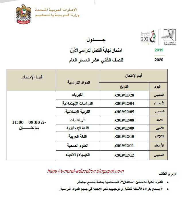 جدول الامتحان الوزارى للصف الثانى عشر المسار العام للفصل الدراسى الأول 2019 الامارات مدرستي الاماراتية