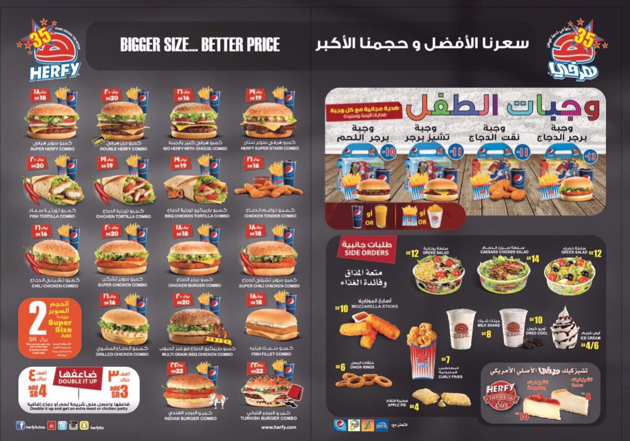سعر وجبة برجر دجاج التي ت قدم مع هرفي كبير بالجبنة و 2 بيبسي. تورتيلا دجاج باربيكيو ب ١٦ ريال. تنتشر سلسلة مطاعم هيرفي في أنحاء المملكة ويتميز المطعم بمأكولاته اللذيذة وأسعاره المناسبة جدا لجميع الأصناف المقدمة كذلك العروض القوية التي ينافس بها جميع المطاعم علي الساحة. وجبة دجاج مسح ب.
