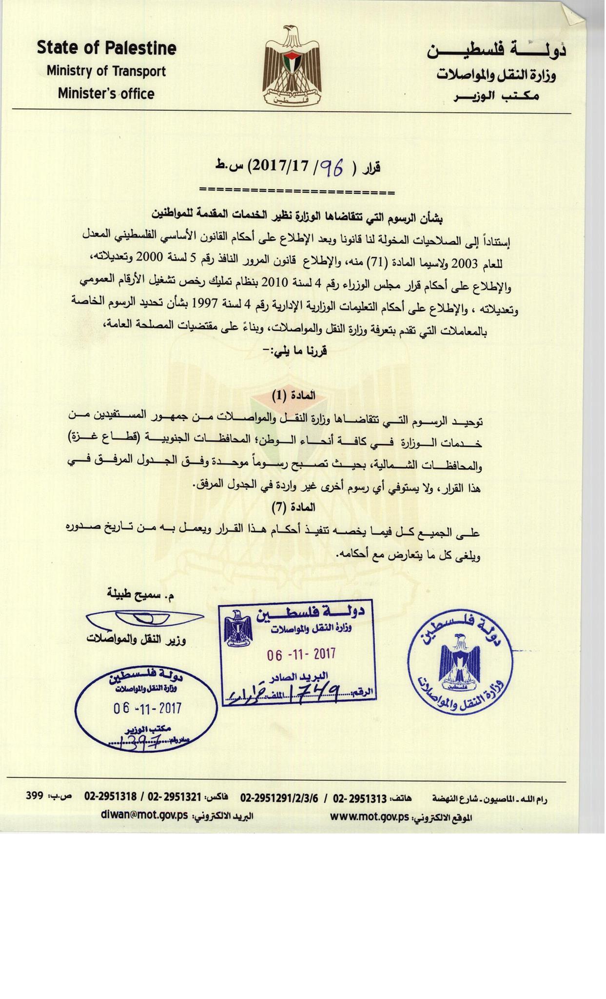 النقل تقر توحيد الرسوم في جميع الأراضي الفلسطينية معلومات مباشر